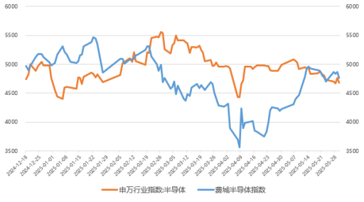 從資本市場(chǎng)指數(shù)來(lái)看,5月費(fèi)城半導(dǎo)體指數(shù)(SOX)上升10.4%,中國(guó)半導(dǎo)體(SW)行業(yè)指數(shù)下降7.9%,國(guó)內(nèi)半導(dǎo)體資本市場(chǎng)受關(guān)稅沖擊明顯。