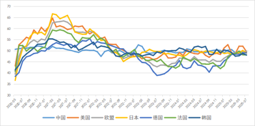 10月,全球制造業(yè)PMI波動(dòng)持續(xù),各國(guó)/地區(qū)經(jīng)濟(jì)表現(xiàn)呈現(xiàn)出顯著分化。除美國(guó),中國(guó)、法國(guó)、韓國(guó)及日本均有所下跌。其中,歐盟地區(qū)經(jīng)歷超三年的持續(xù)收縮后止跌企穩(wěn),但未能實(shí)現(xiàn)增長(zhǎng),需求增長(zhǎng)乏力。