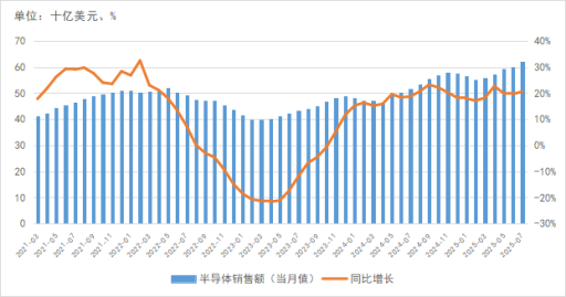 根據(jù)SIA最新數(shù)據(jù),2025年7月全球半導(dǎo)體市場(chǎng)銷售額為620.7億美元,同比增長(zhǎng)20.6%,連續(xù)15個(gè)月同比增速超17%。