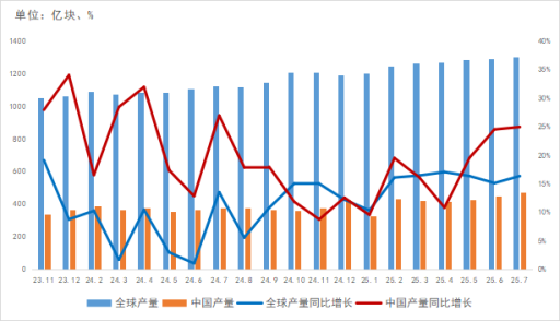 從集成電路產(chǎn)量看,8月全球及中國(guó)集成電路產(chǎn)量分別為1295億塊、425.0億塊,同比增長(zhǎng)穩(wěn)定。